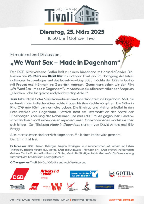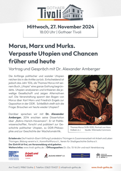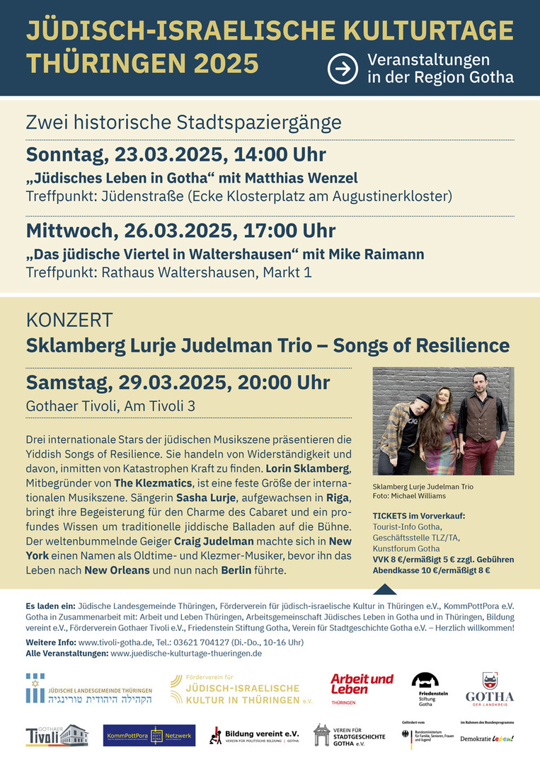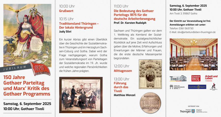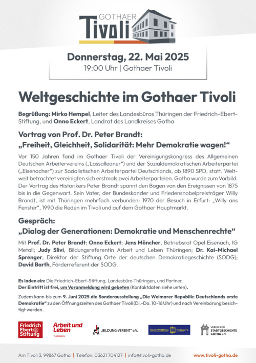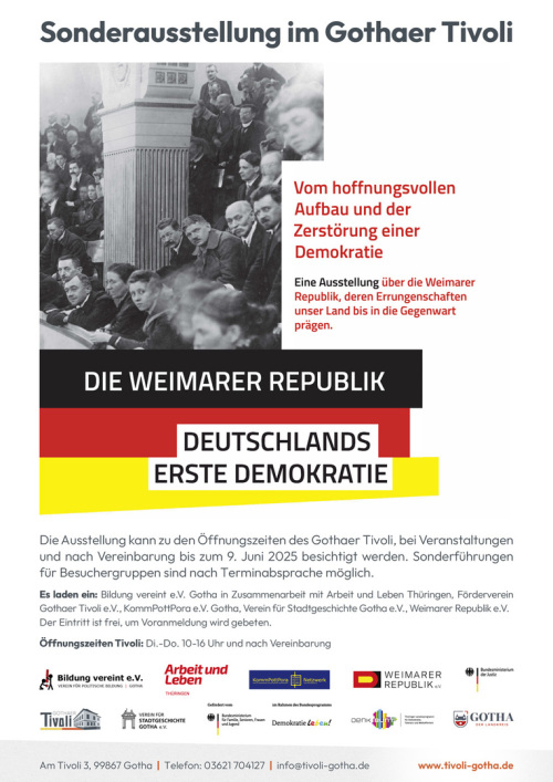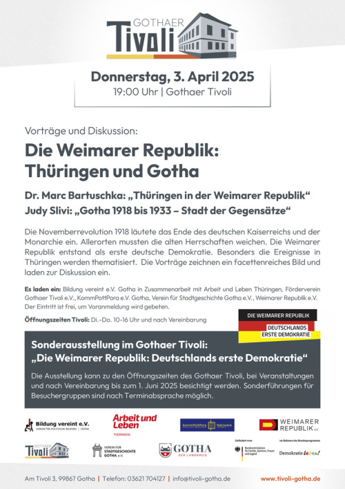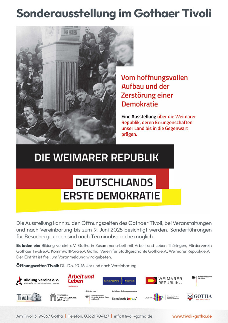 Es laden ein: Weimarer Republik e.V. in Kooperation mit: Arbeit und Leben Thüringen, art der stadt Gotha e.V., Bildung vereint e.V., DGB Kreisverband Gotha, Förderverein Gothaer Tivoli e.V., KommPottPora e.V., Partnerschaft für Demokratie im Landkreis Gotha, ver.di Ortsvorstand Gotha, Verein für Stadtgeschichte Gotha e.V.